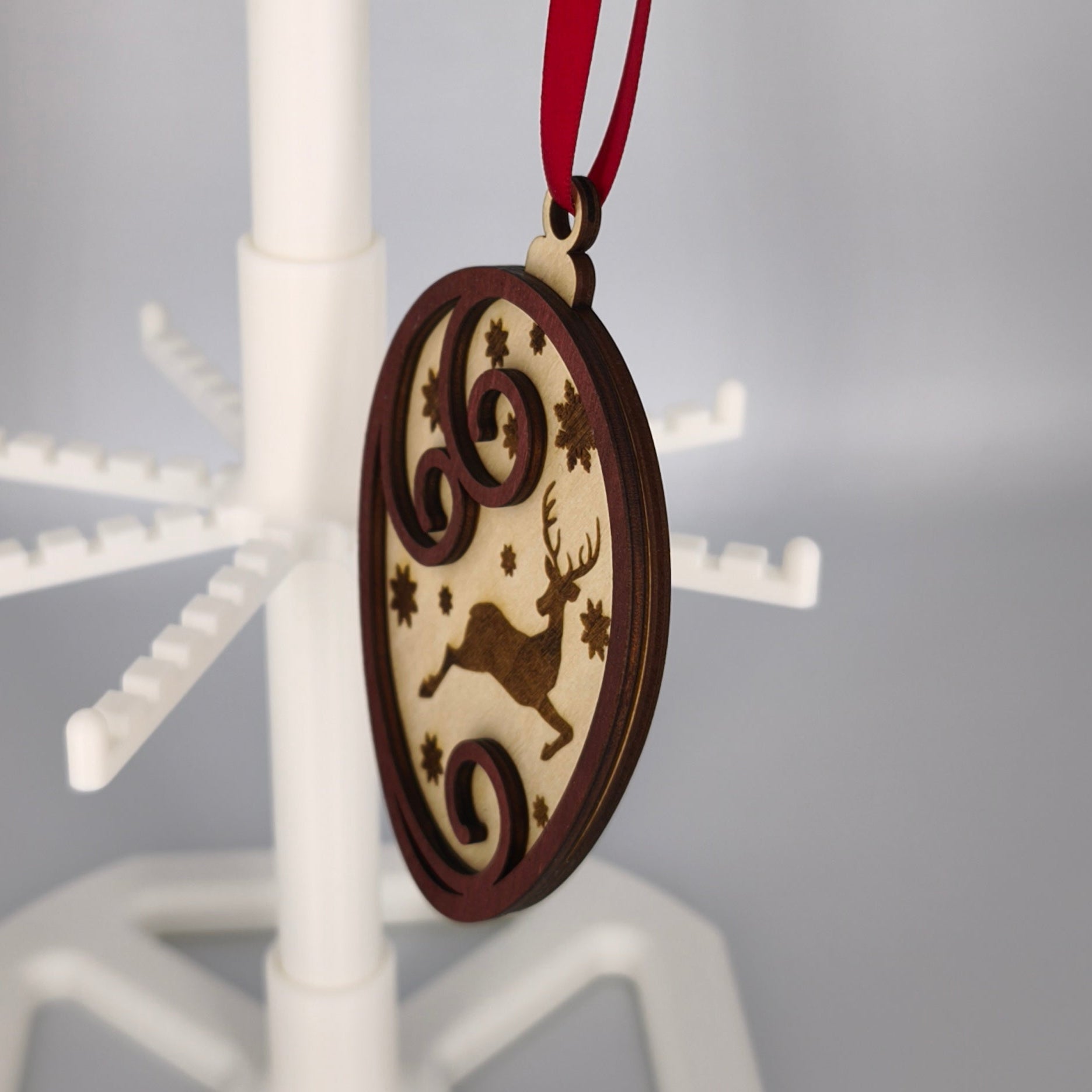 Charmante décoration de Noël en bois avec un Cerf gravé. Crée à partir de 2 planches de bois avec une teinte claire et une teinte foncée, découpées et assemblées, c'est un ornement original pour votre sapin de Noël !