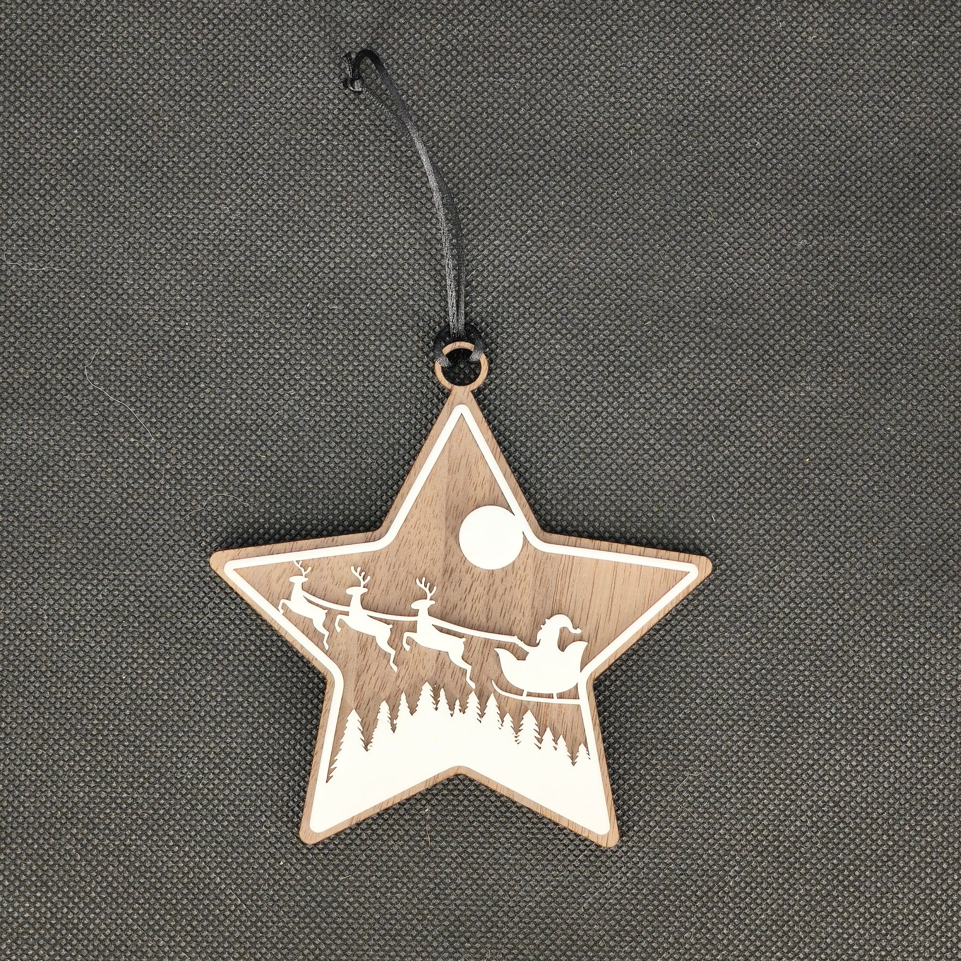 Charmante décoration de Noël en forme d'étoile. Crée à partir de 2 planches de bois avec une teinte claire et une teinte foncée, découpées et assemblées, c'est un ornement original pour votre sapin de Noël !