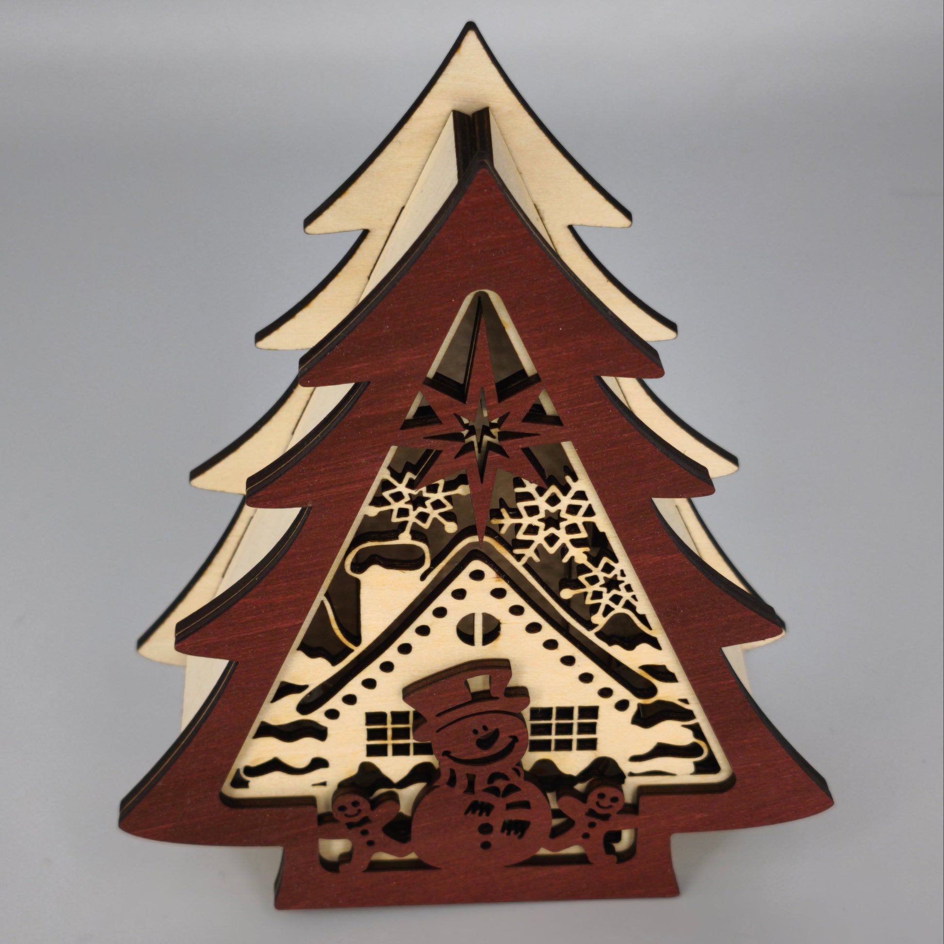 Charmante décoration en bois en forme de Sapin de Noël. Assemblage de 2 planches de bois découpées avec des ornements de Noël repartis en 2 teintes de bois. Le sapin est illuminé par un éclairage fixé à l'intérieur. L'interrupteur et les piles sont à l'extérieur du sapin reliés par un câble discret et transparent à l'arrière du produit.
