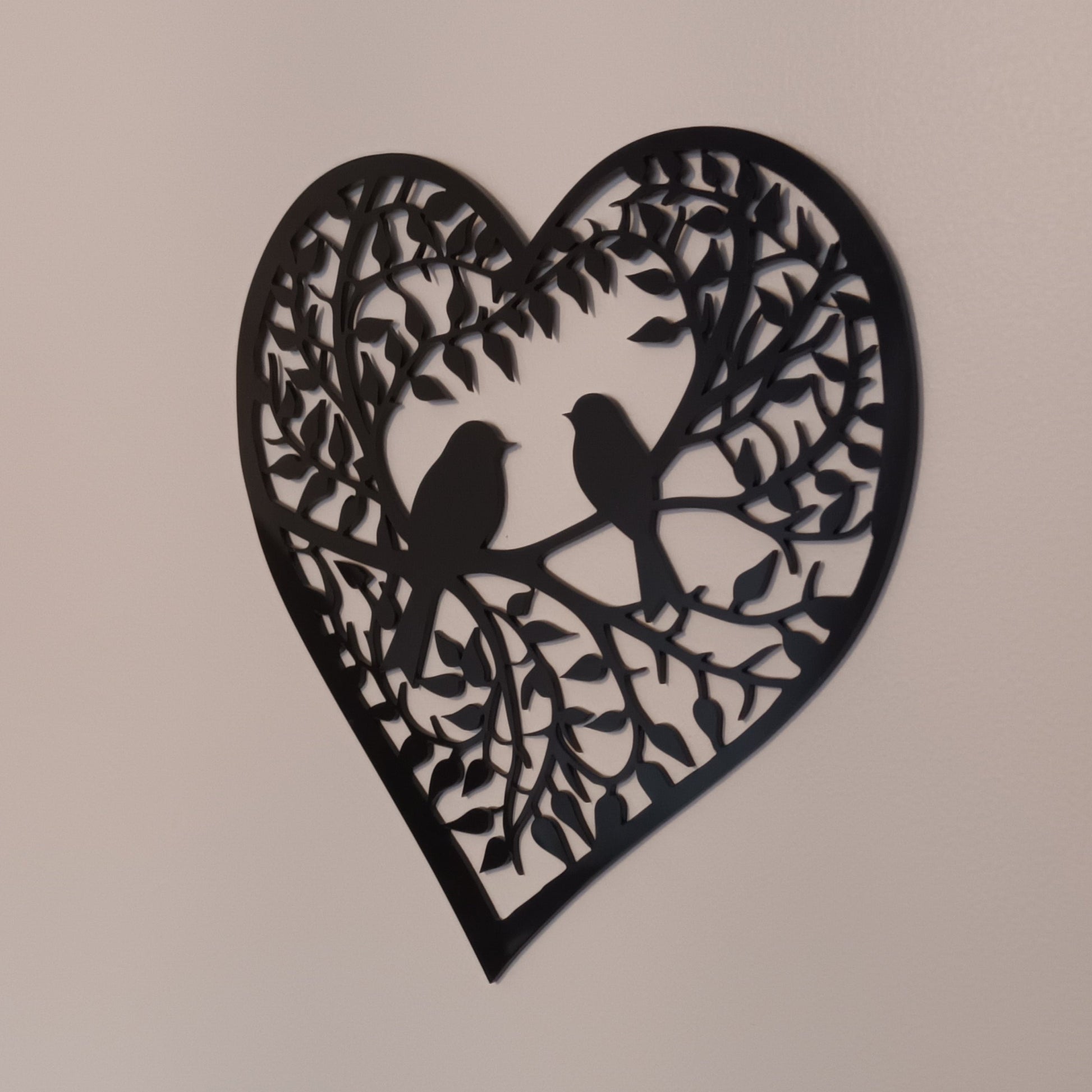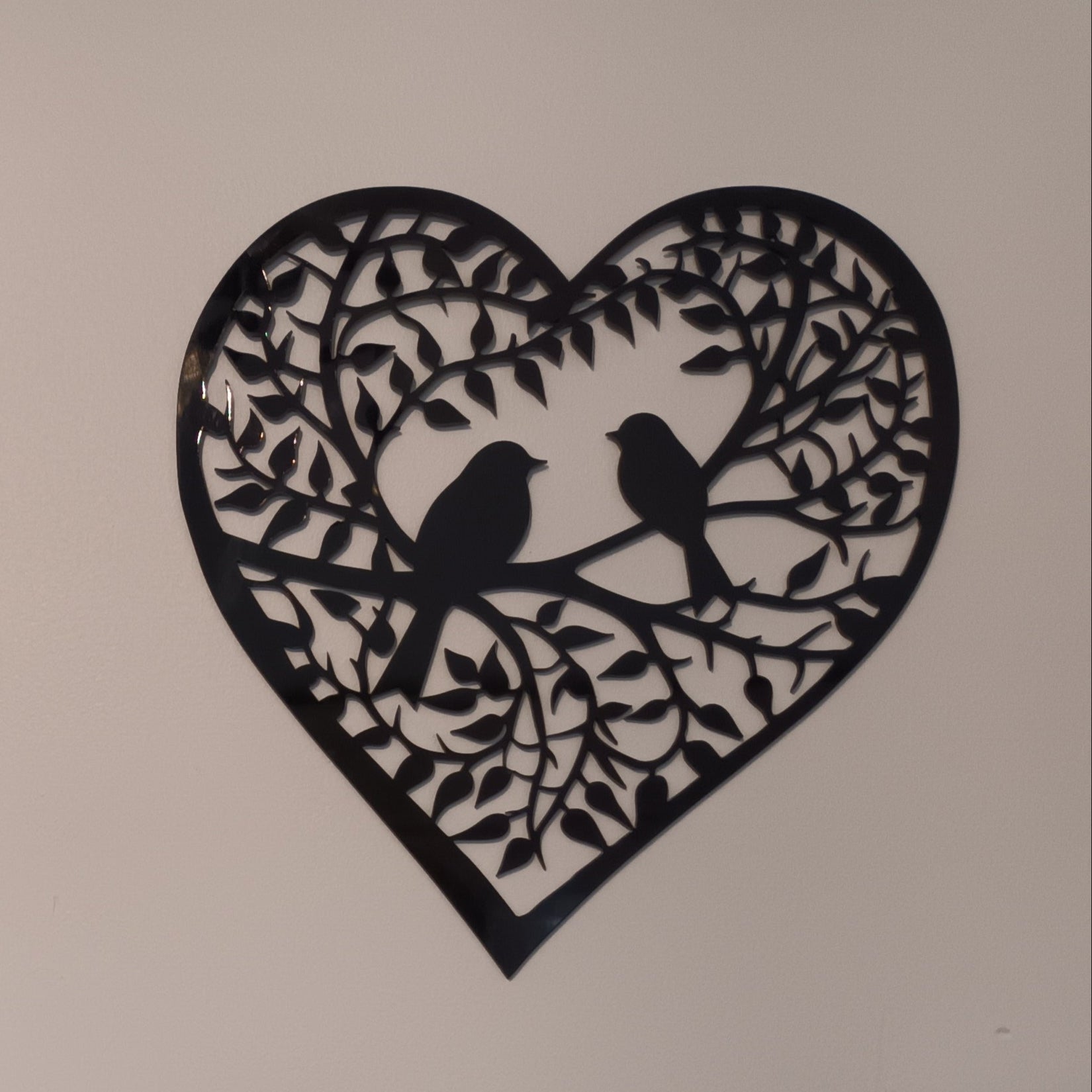 Belle décoration murale en acrylique représentant un couple d'oiseaux dans un arbre en forme de cœur. Choisissez la couleur que vous souhaitez parmi notre sélection et accrochez le chez vous sans trous grâce à notre adhésif inclus !