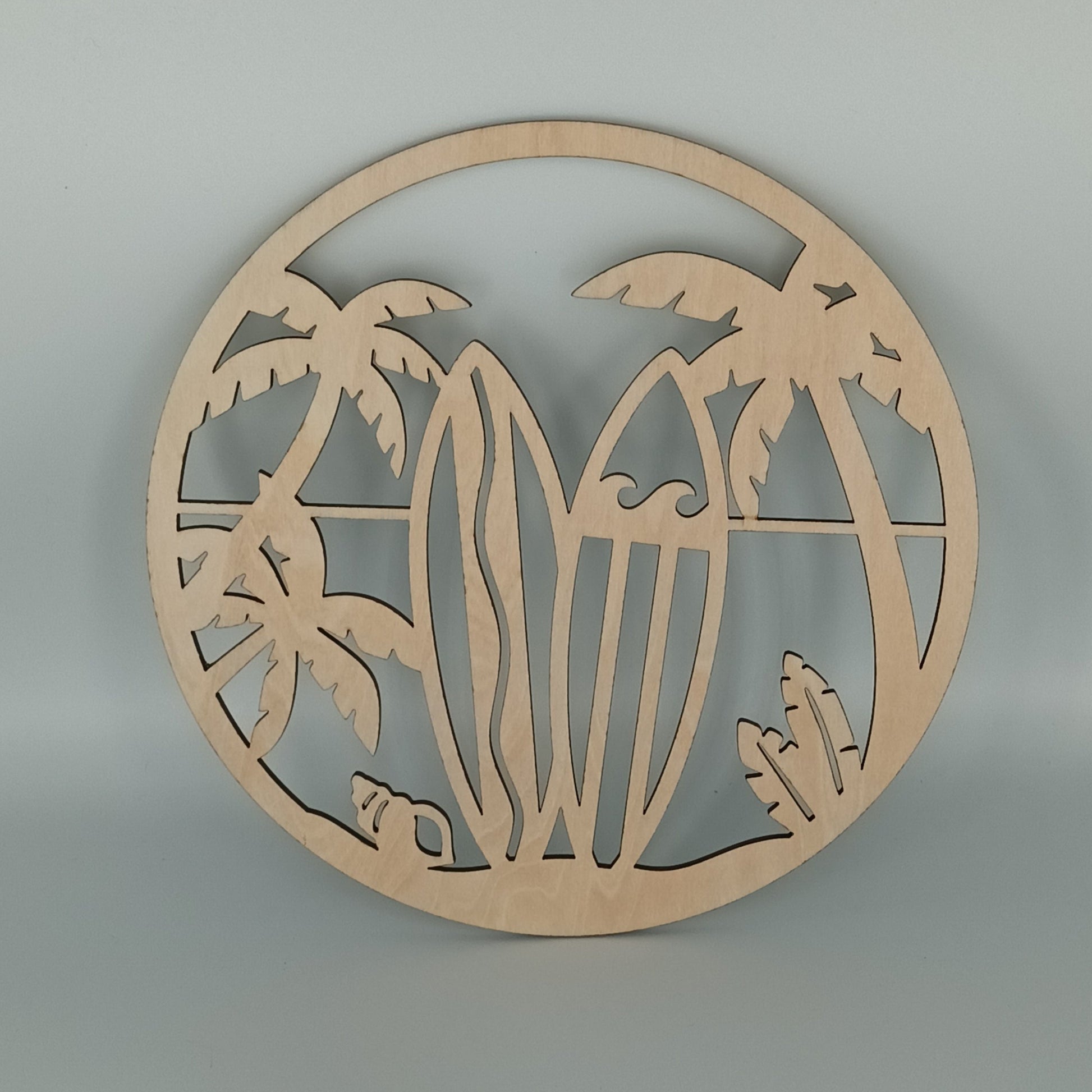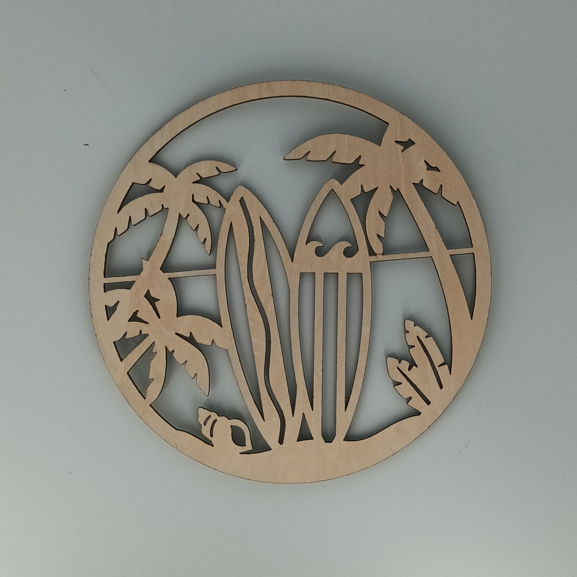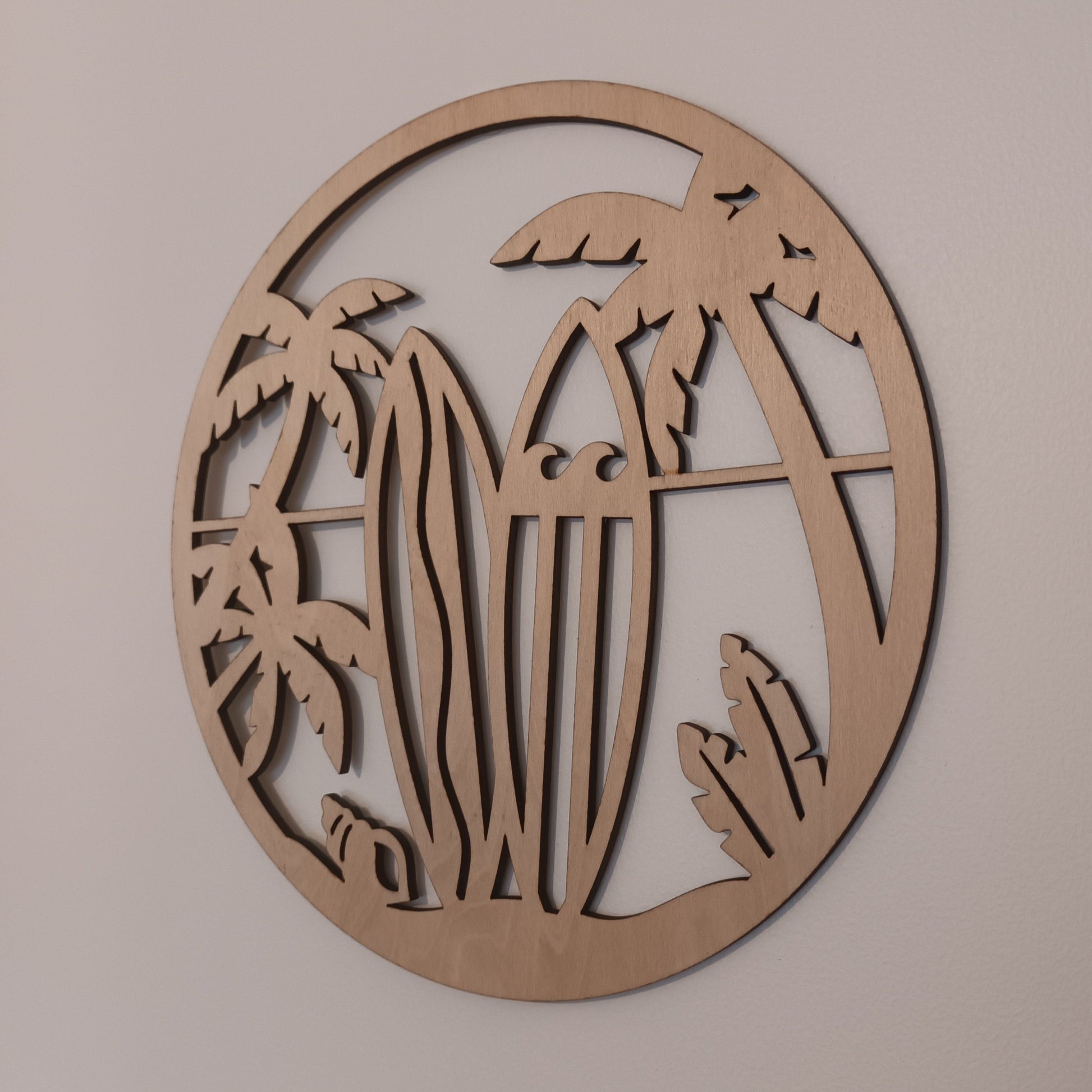 Belle décoration murale en bois de tilleul représentant une planche de surfeurs. Accrochez le chez vous sans trous grâce à notre adhésif inclus !