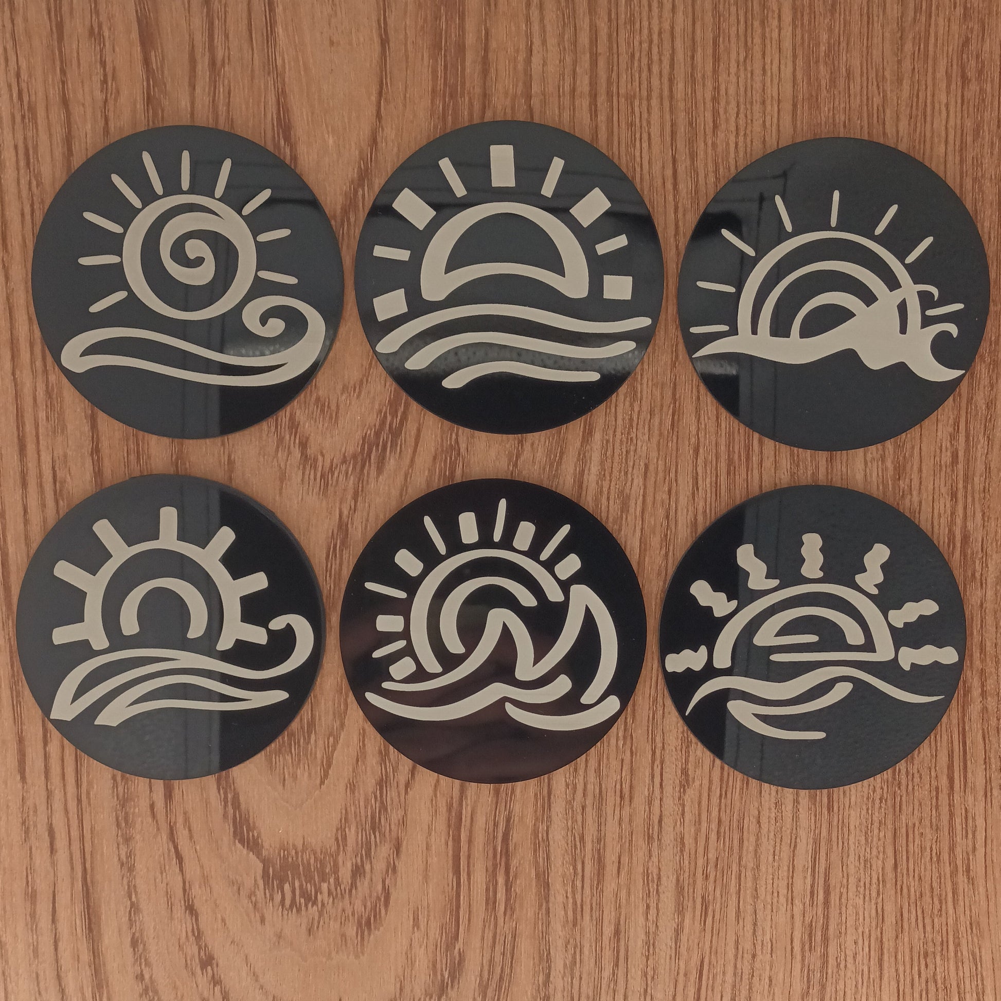 Ces 6 dessous de verre en acrylique dans le thème du Sunset Beach représentent des couchés de soleil différents. La gravure blanche sur la surface lisse donne un aspect anti-dérapant pour vos verres. En plus d'être résistants aux éléments extérieurs, ils s'accordent parfaitement dans les apéritifs en cette période estivale. Avec leur diamètre de 9cm, ils iront parfaitement pour tous vos verres !
