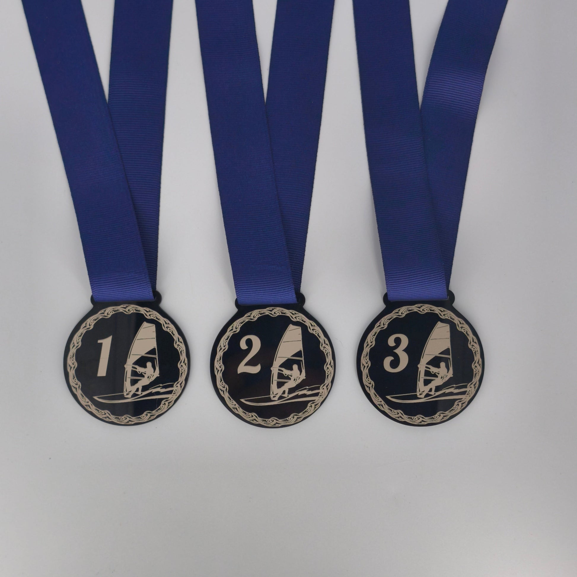 Lot de 3 médailles en acrylique. Sur le recto, importez votre image/logo qui ressortira de couleur claire, et au verso, ajoutez quelques lignes de texte.
