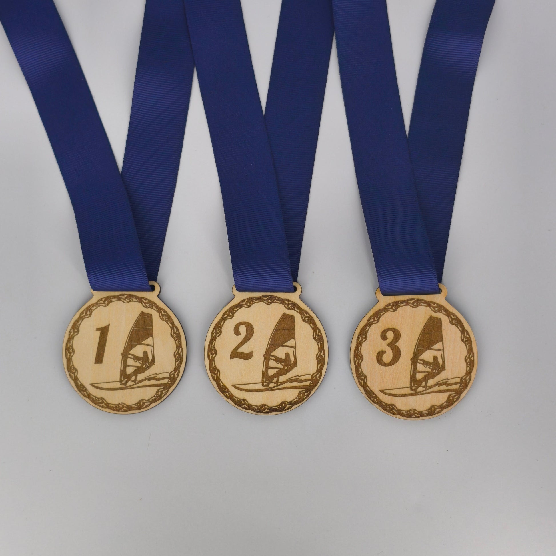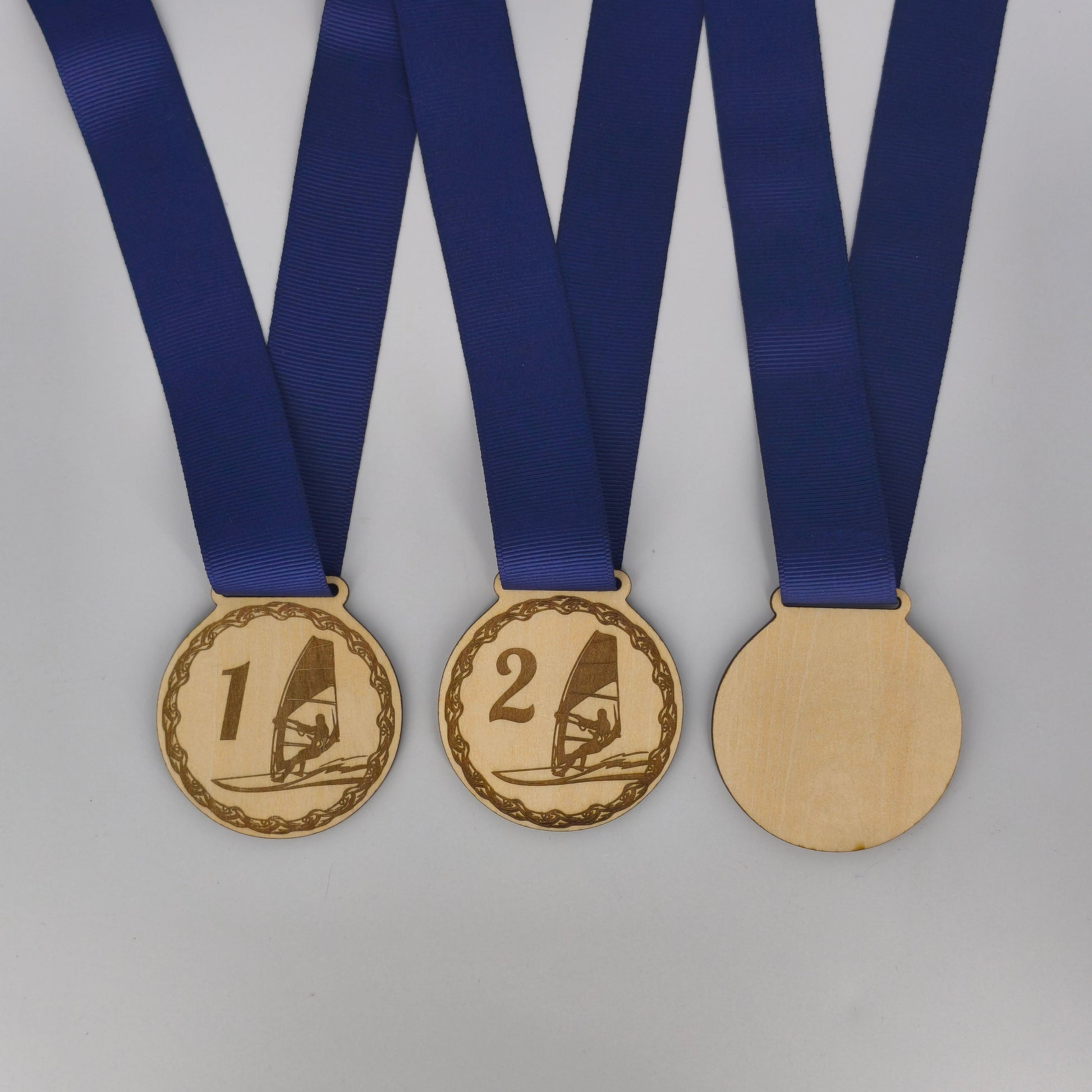 Lot de 3 médailles en bois. Sur le recto, importez votre image/logo qui ressortira de couleur foncée, et au verso, ajoutez quelques lignes de texte.