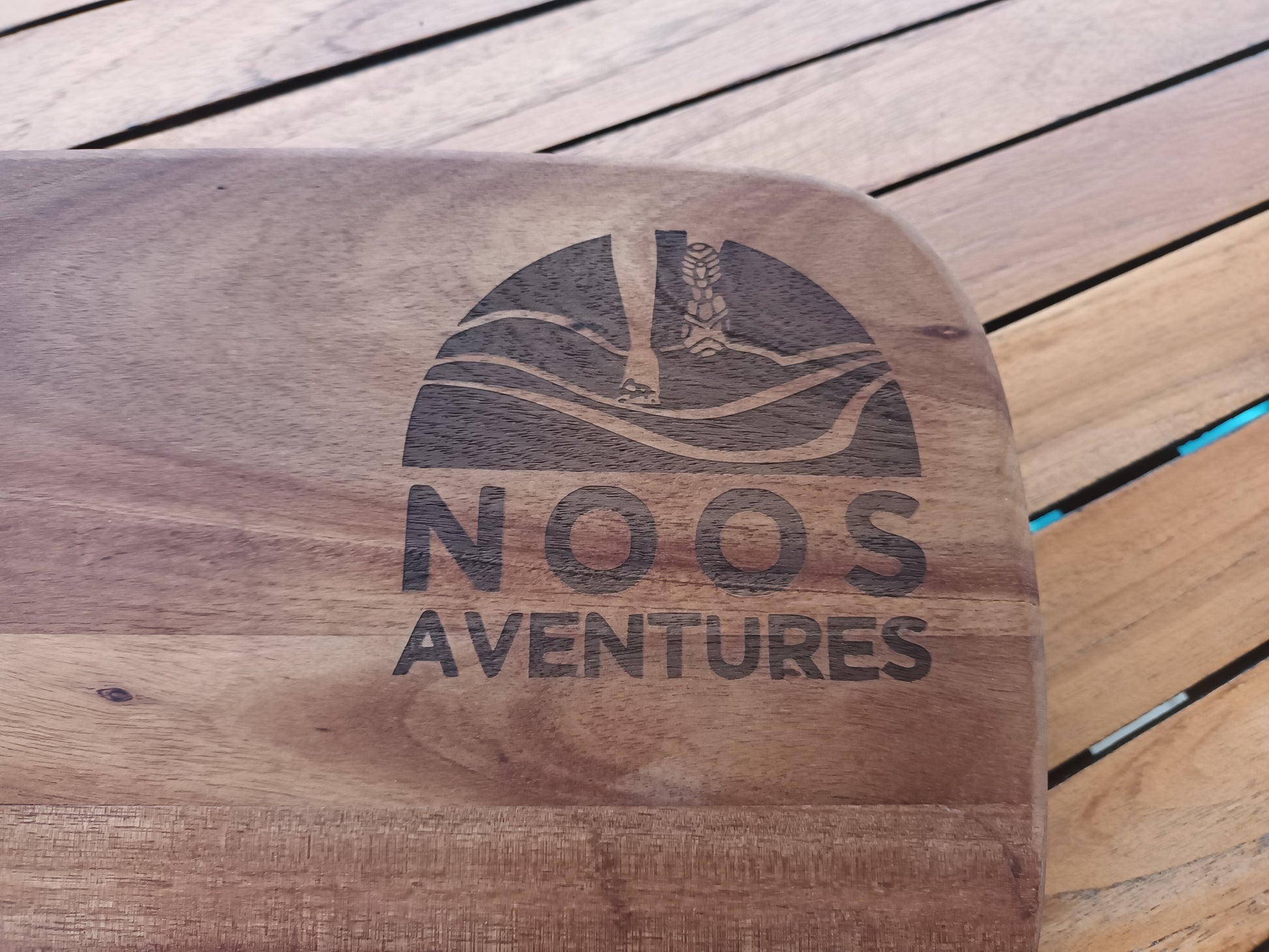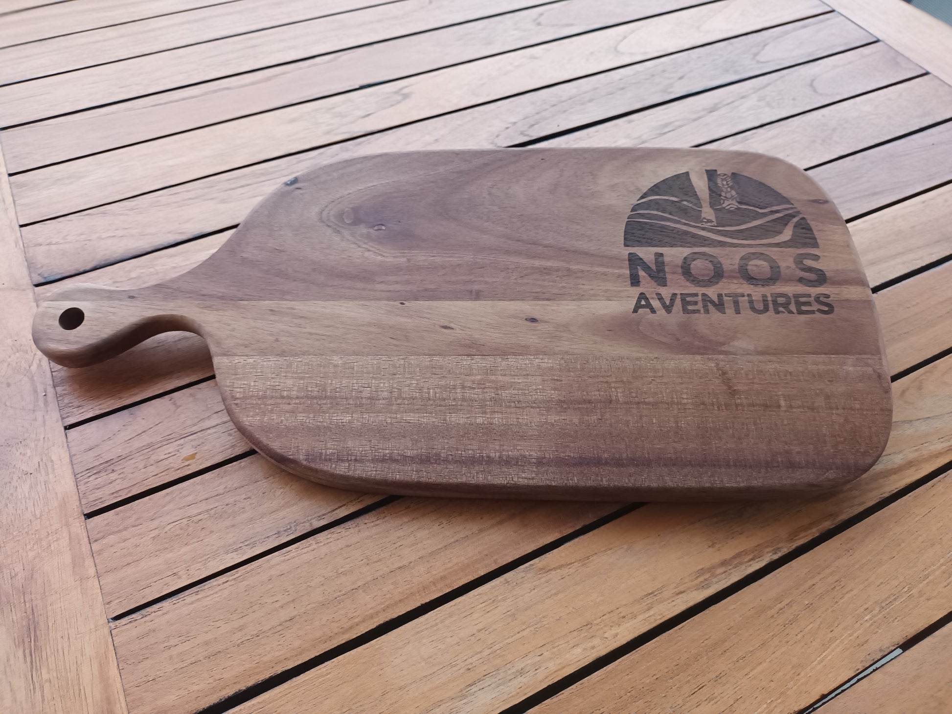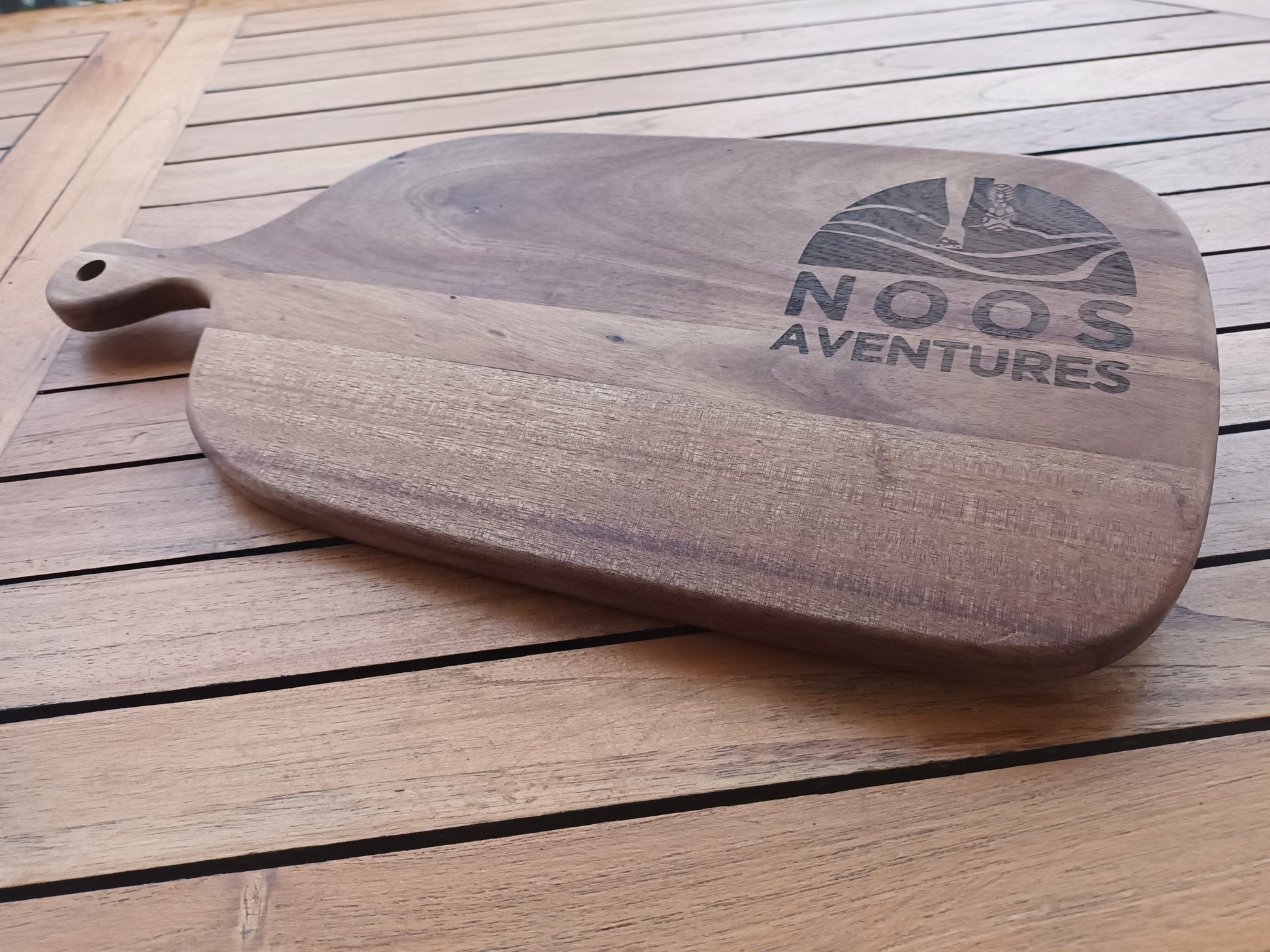 Un ami entrepreneur organise des randonnées vélo découverte de sa région. Maintenant, ses clients et lui profitent de la vue imprenable du paysage après l'effort autour d'un bon saucisson découpé sur une planche en bois personnalisée !
