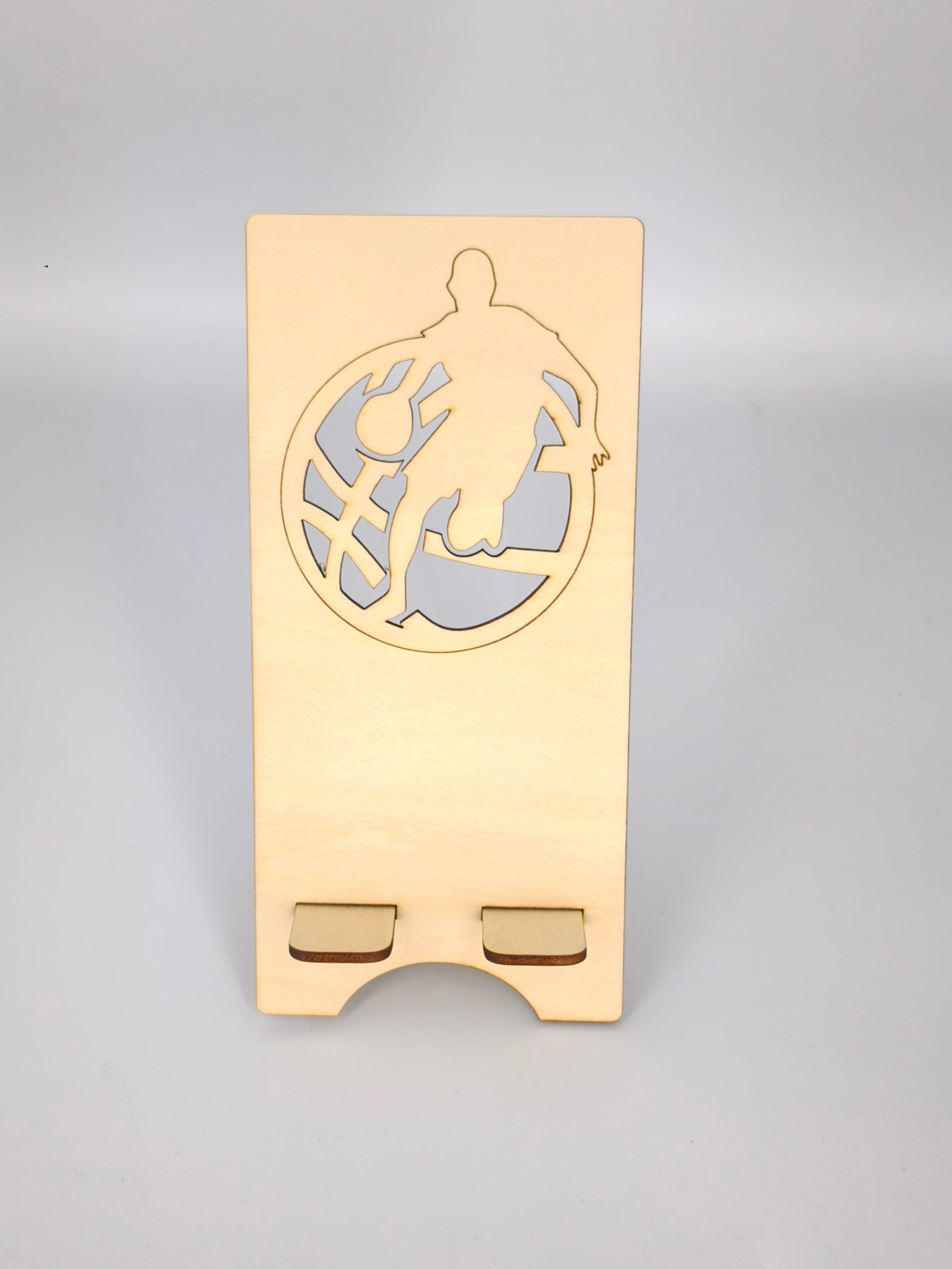 Support de Smartphone sur le thème du Basketball, en acrylique noir ou en bois, personnalisable en dessous du motif avec un logo/image ou du texte (prénom, numéro de maillot). Disponible en 2 modèles.