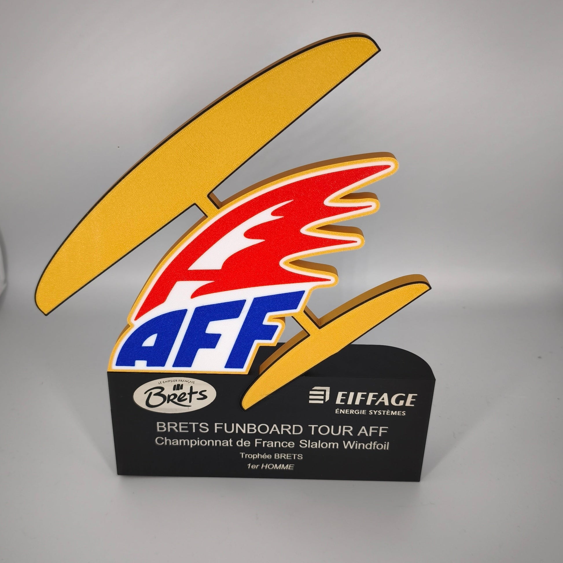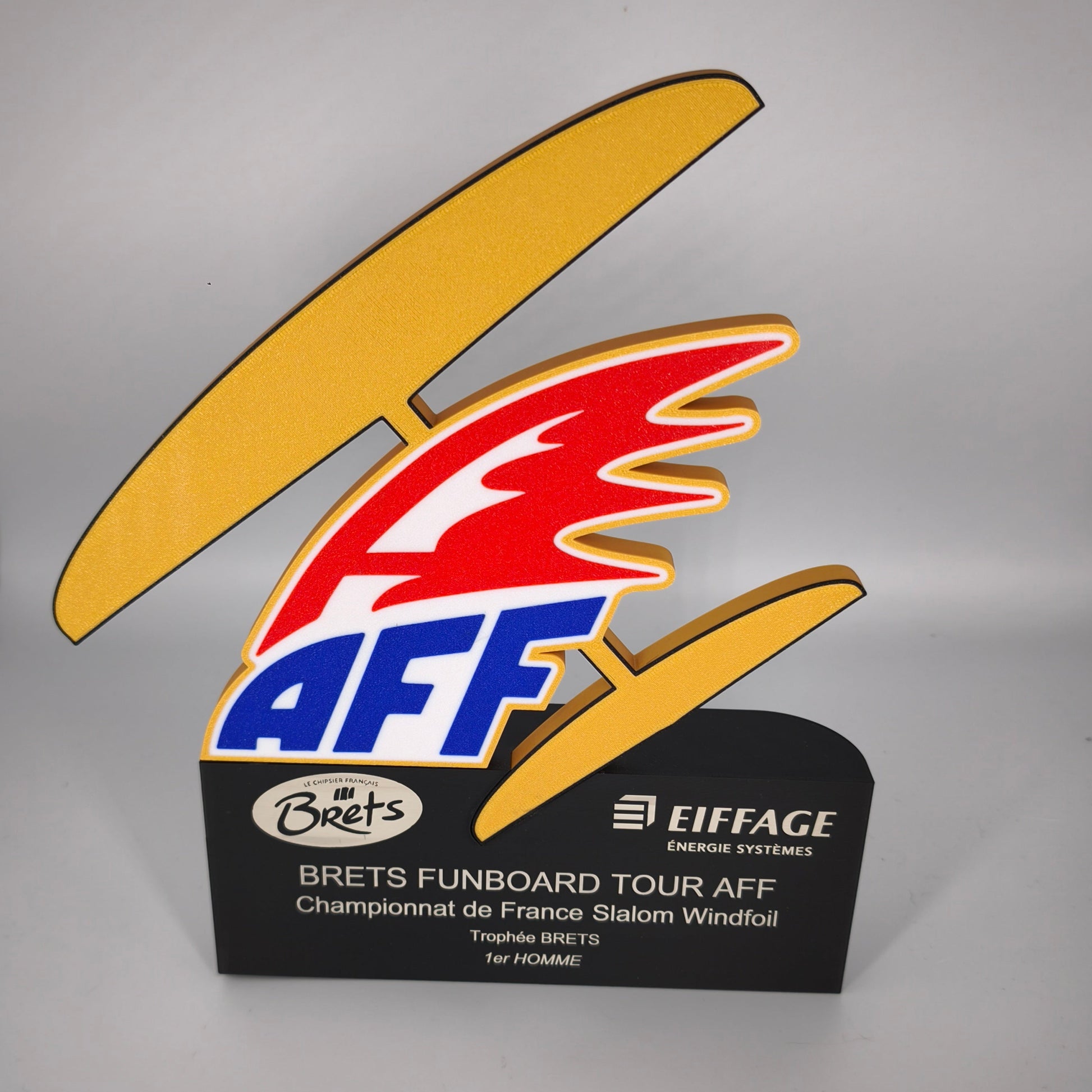 Deux séries de Trophées réalisés sur mesure en impression 3D et gravure laser sur le socle, pour le championnat de France de planche à voile slalom aileron et slalom foil.
