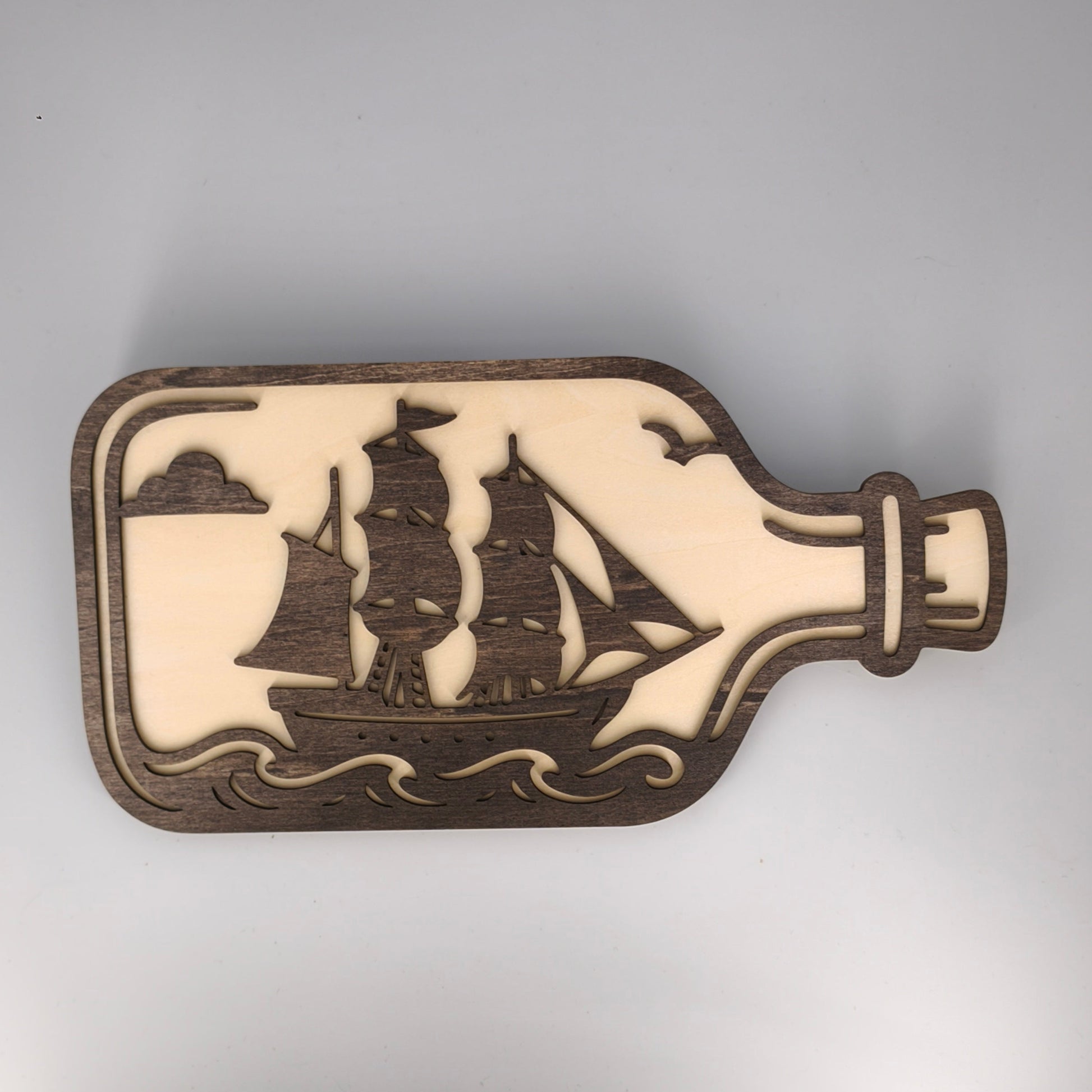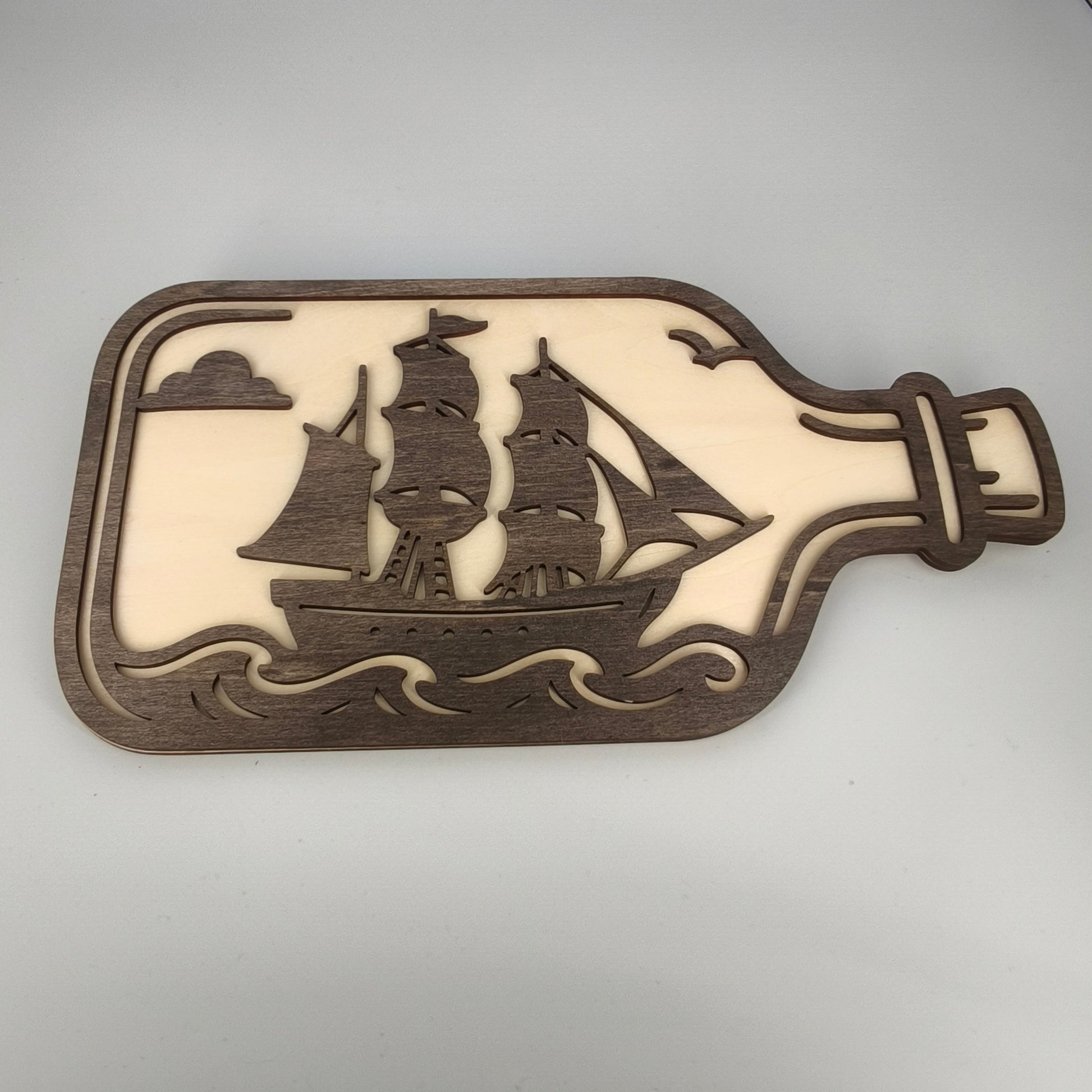 Belle décoration murale en forme de bouteille avec 2 teintes de bois pour représenter un bateau sur l'eau. Accrochez le chez vous sans trous grâce à notre adhésif inclus !