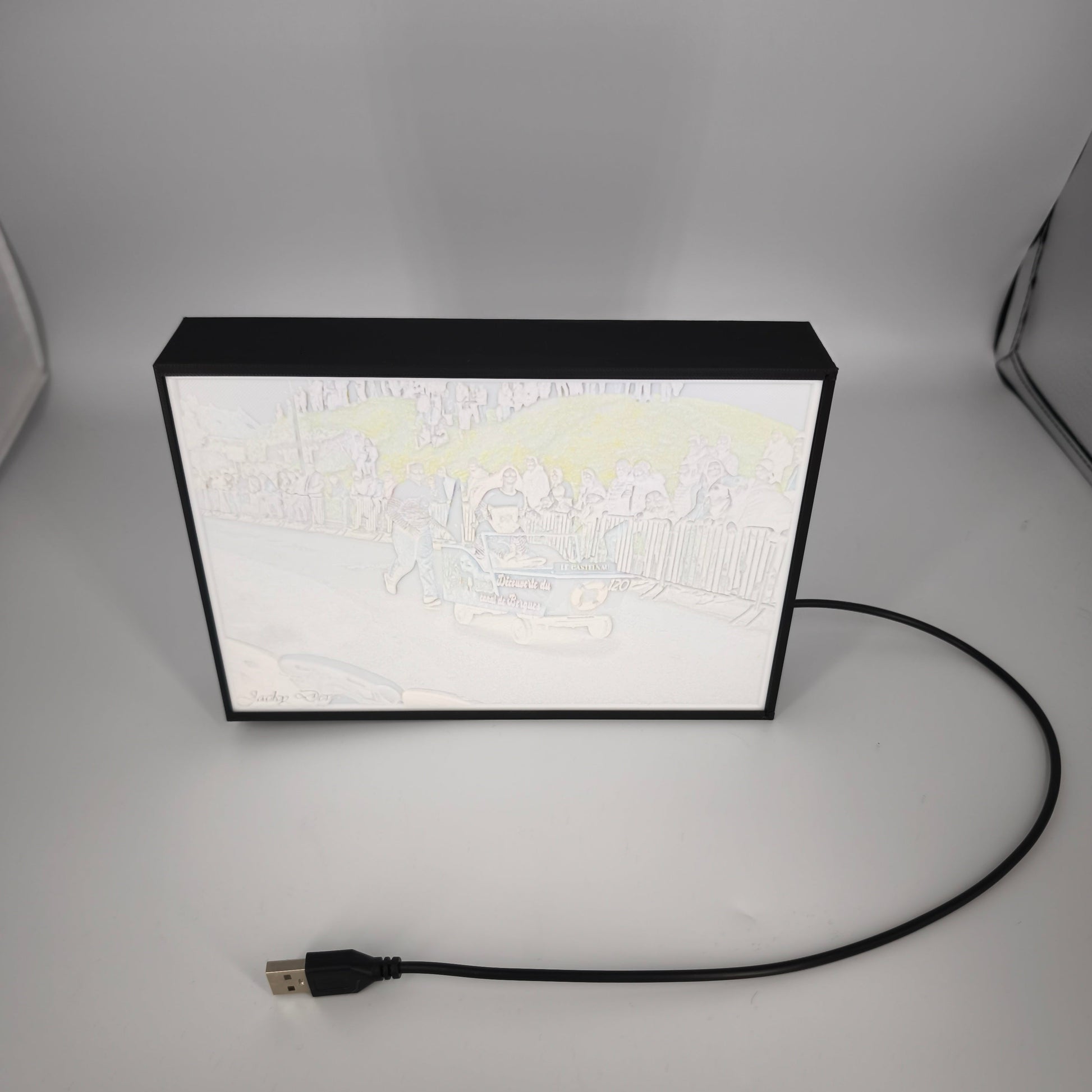 Envie d'une décoration lumineuse originale ? La litophanie est un moyen original et moderne pour sublimer vos photos. Réalisée en impression 3D, cette déco au format 15cm de large par 10cm de haut (taille photo standard adaptable en vertical) est illuminée par des leds à l'intérieur du boitier et se branche via un port USB.