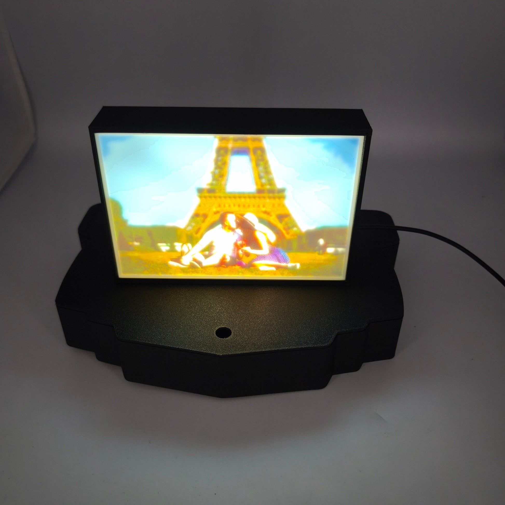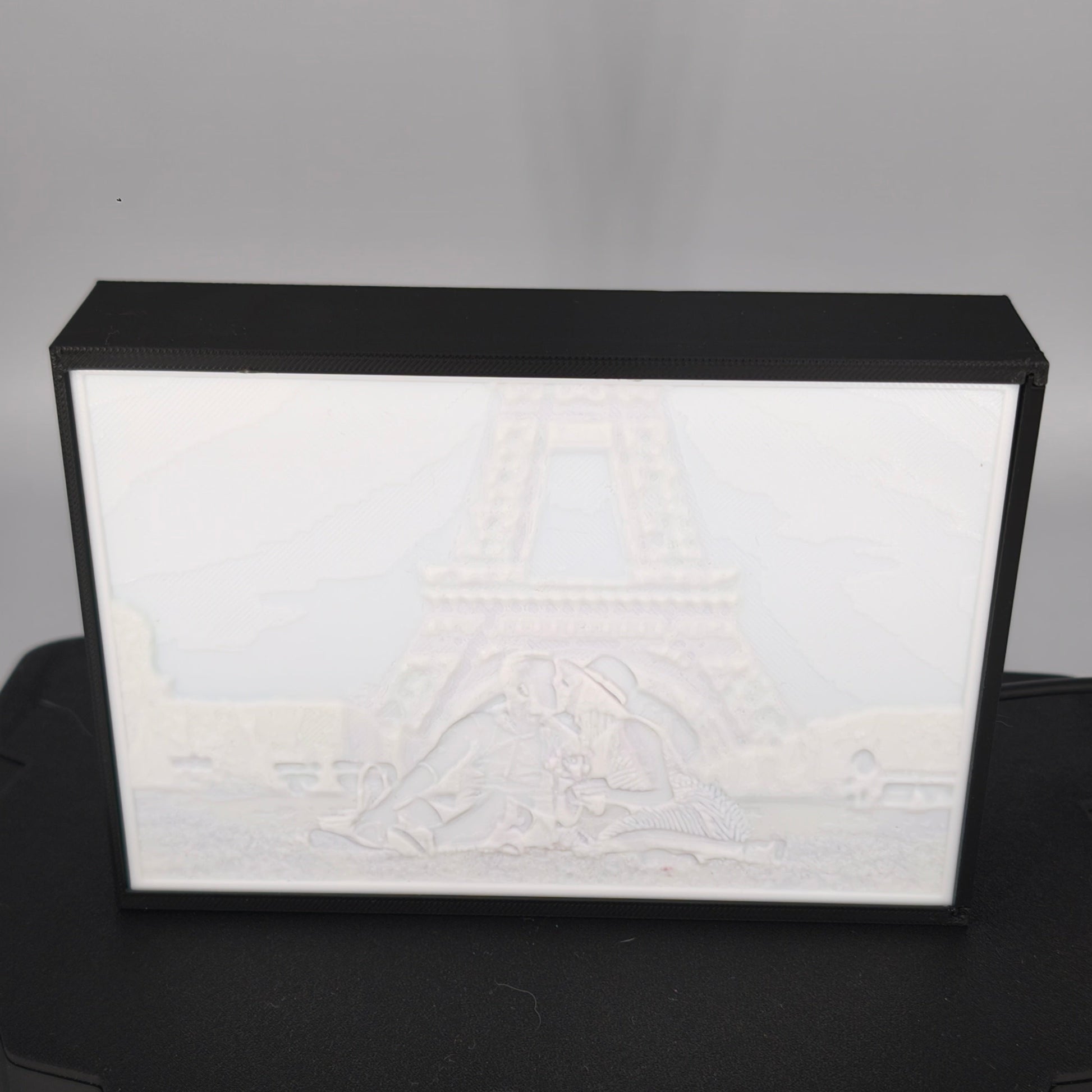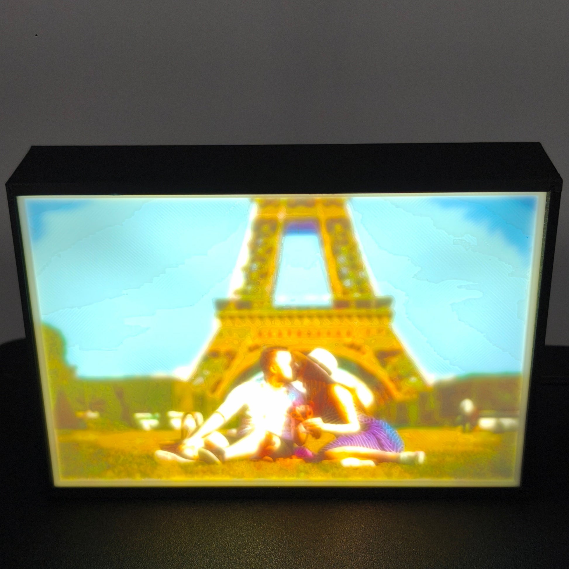 Envie d'une décoration lumineuse originale ? La litophanie est un moyen original et moderne pour sublimer vos photos. Réalisée en impression 3D, cette déco au format 15cm de large par 10cm de haut (taille photo standard adaptable en vertical) est illuminée par des leds à l'intérieur du boitier et se branche via un port USB.